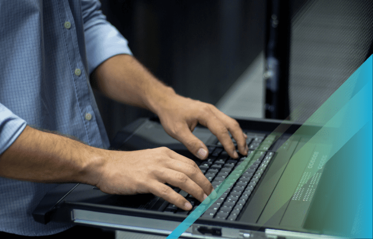 A man with glasses using a laptop in a server room, reflected in the glass of a server rack.
